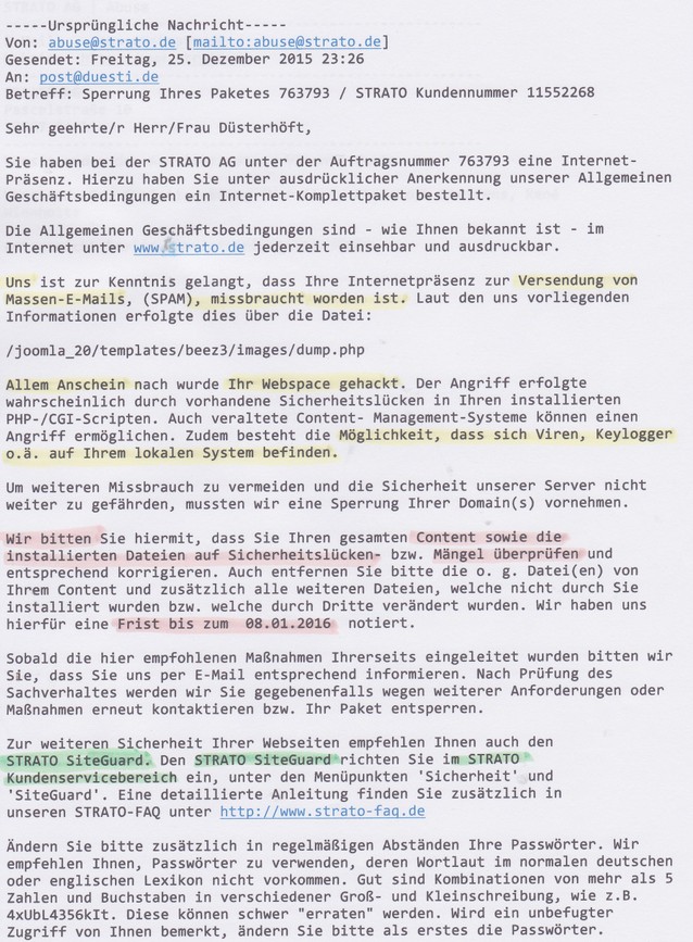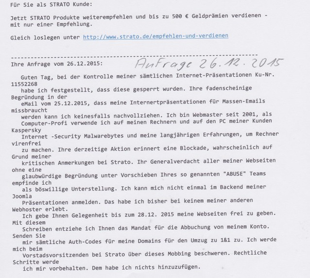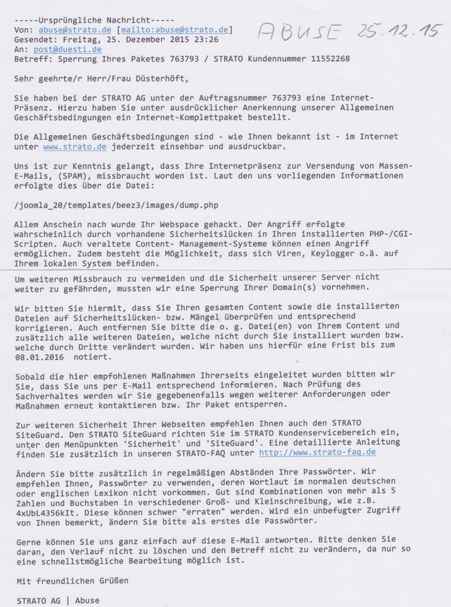 STRATO/ABUSE: Antwort vom 25.12.2015 mit einem Erklärungsversuch für die Sperre meines Webspace.