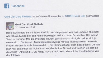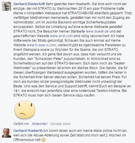 Anfang Januar 2016 postete ich erstmals seit längerer Zeit wieder auf Facebook. Ich schilderte das Problem auf der Facebook-Seite von STRATO und konnte feststellen, dass es noch andere Kunden von STRATO gab, deren Webspace ebenfalls zu Weihnachten 2015 gesperrt wurde.